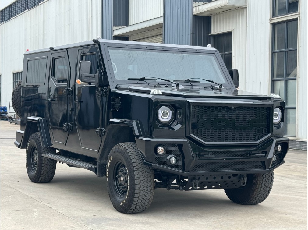 恐狼防弹SUV采用美国福特F550底盘改装而成,车身六面采用防弹材料制作,防弹等级可以达到B4+(B级防弹)/B6/STANAG 1级。前门和中门安装了电动玻璃升降机构,防弹玻璃窗的开度达60%,用于通风换气、对外联络和逃生。带内支撑体的轮胎和轮毂,确保轮胎漏气时可以40km/h的车速继续行驶30公里。8缸255千瓦的发动机,最高车速达140km/h。10AT自动变速箱、盘式制动结合ABS和安全气囊使得该车操作性能优越、制动可靠。五门七座的布局,车内前后间距大,满足4-7名乘员长时间乘坐的舒适性。标配的中控门锁、倒车雷达以及360°环影确保车辆使用的安全与便捷。恐狼防弹商务车适合政府要员、企业精英和VIP等人士的安全出行。